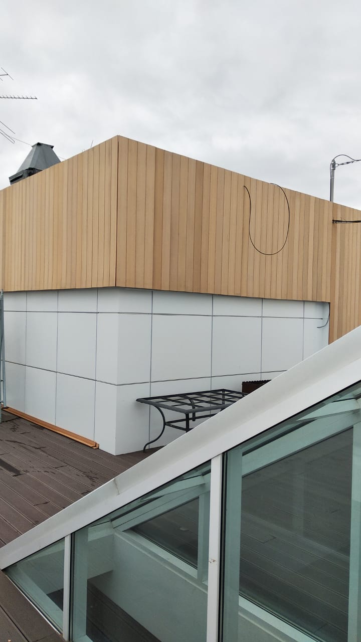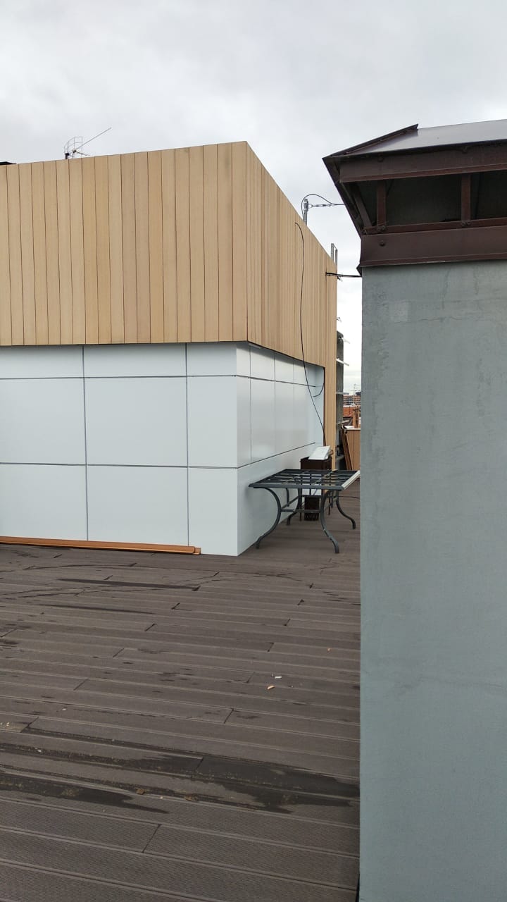 - Краснодар, эксплуатируемая кровля, частное домовладение, декинг вельвет классик коричневый, сайдинг винтаж натуральный
